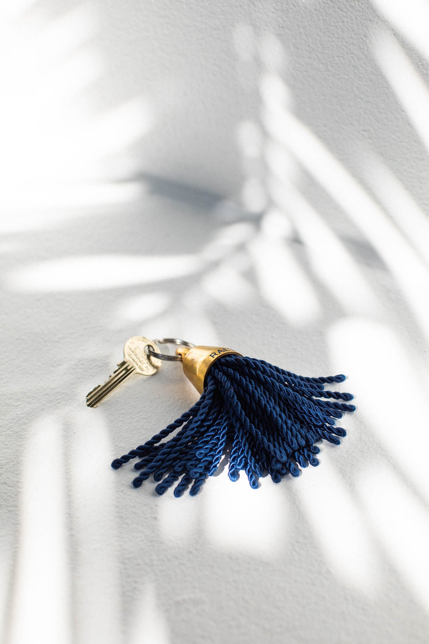 Solid polished brass with a blue silk tassel, our keychains are engraved with Raes.